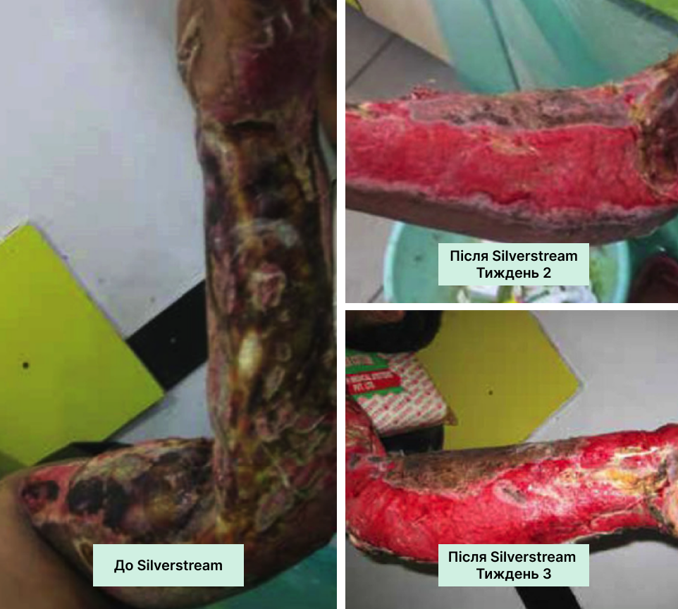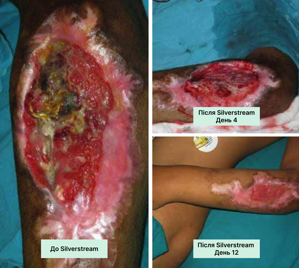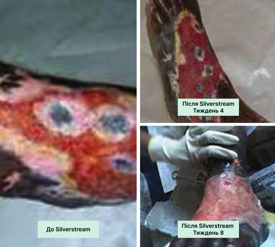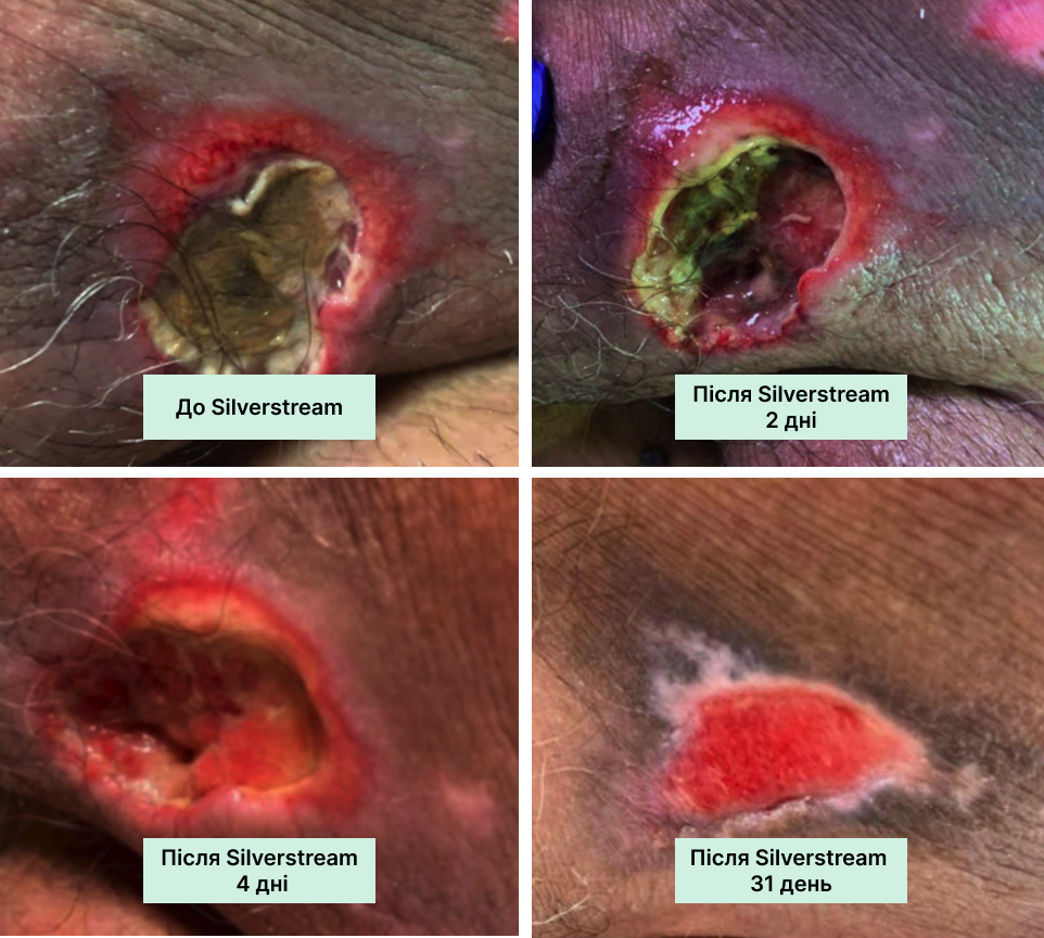 На чисту рану з доброю грануляцією нанесіть SilverStream, дайте висохнути. Потім нанесіть тонкий шар колагену, накрийте вторинною пов’язкою. Регулярно оцінюйте стан рани та коригуйте терапію за потреби.