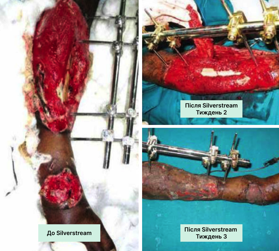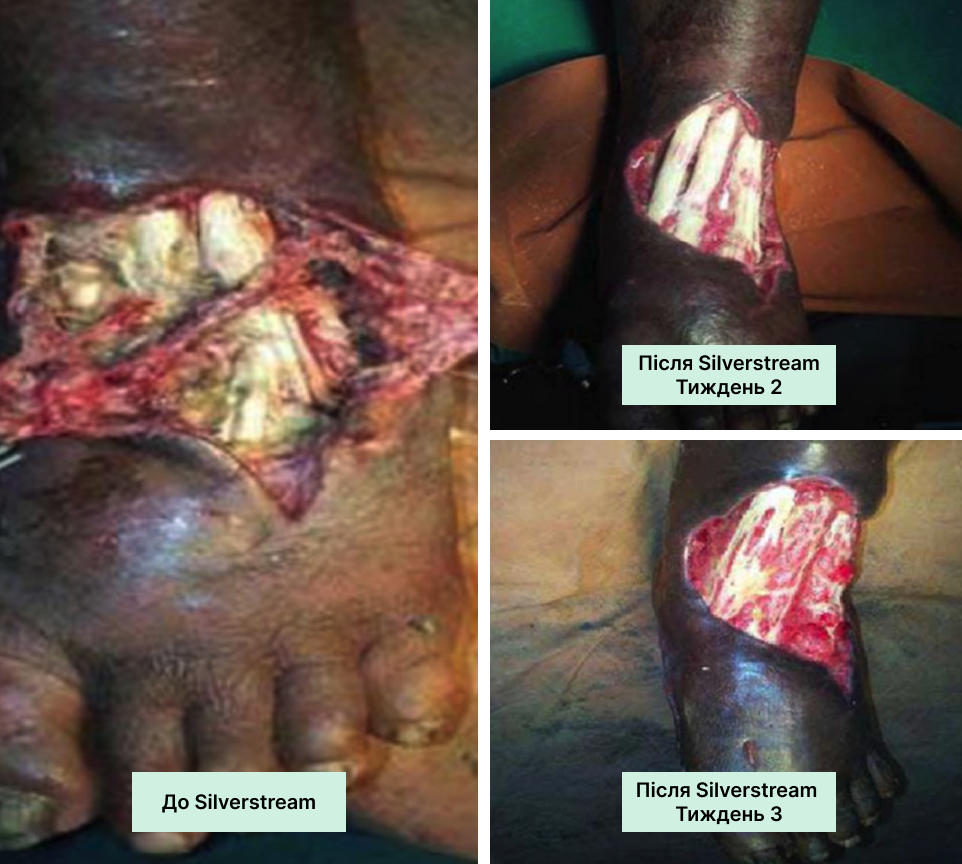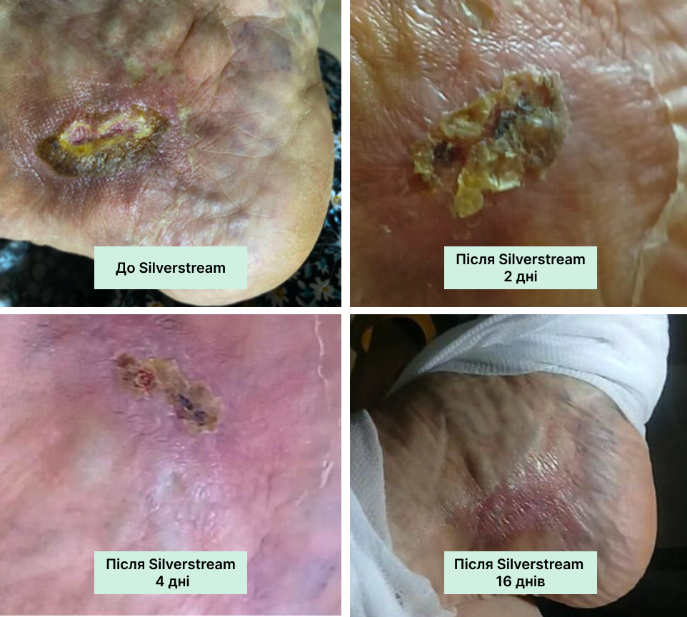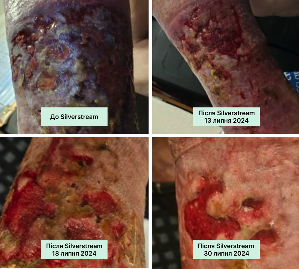 На чисту рану з доброю грануляцією нанесіть SilverStream, дайте висохнути. Потім нанесіть тонкий шар колагену, накрийте вторинною пов’язкою. Регулярно оцінюйте стан рани та коригуйте терапію за потреби.