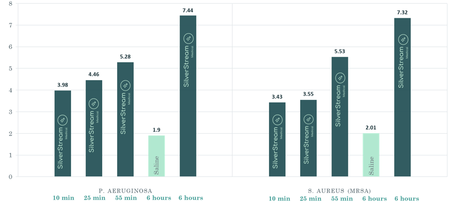 • Довгострокова ефективність: >Log 5 зниження через 55 хвилин та повне знищення біоплівки (Log 7,44 для P. aeruginosa і Log 7,32 для S. aureus MRSA) через 6 годин. Це забезпечує безперервний захист і підтримку загоєння між змінами пов’язок, мінімізуючи ризик інфікування та сприяючи швидшому відновленню.
