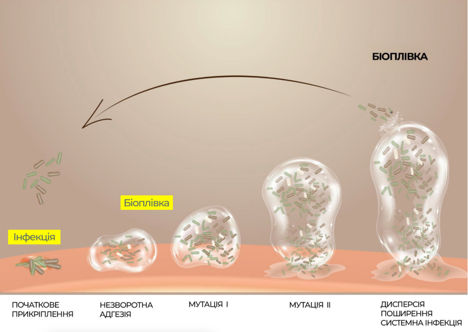 Біоплівки подовжують запалення, пошкоджують тканини та перешкоджають загоєнню ран. Вони уникають імунної відповіді, руйнують тканини та чинять опір антимікробним засобам, що значно ускладнює процес відновлення. Інфекція прогресує до утворення біоплівки, створюючи бар’єр, який захищає бактерії, порушує загоєння рани та призводить до повторного інфікування.