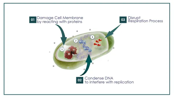 Іони срібла проникають у клітини, зв’язуючись з ДНК та рибосомальними компонентами. Це пригнічує реплікацію, транскрипцію та синтез білка, додатково порушуючи функції мікроорганізмів.